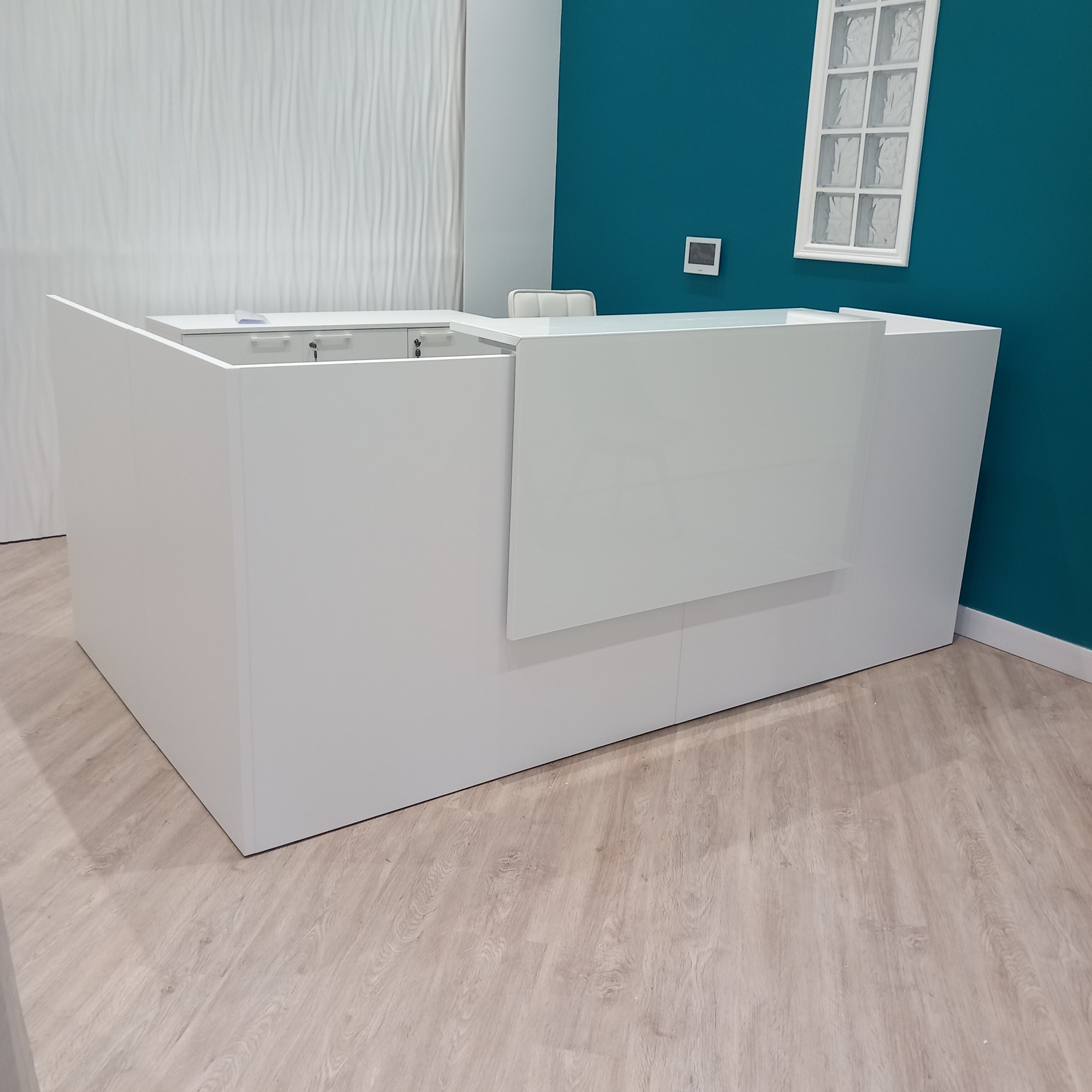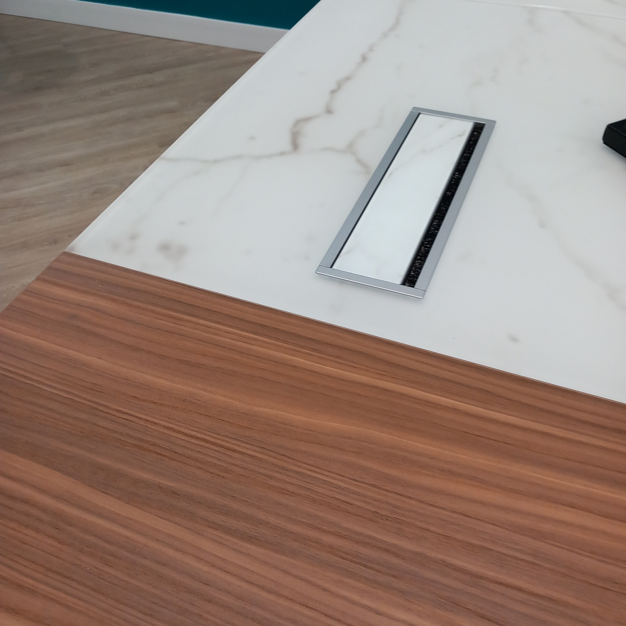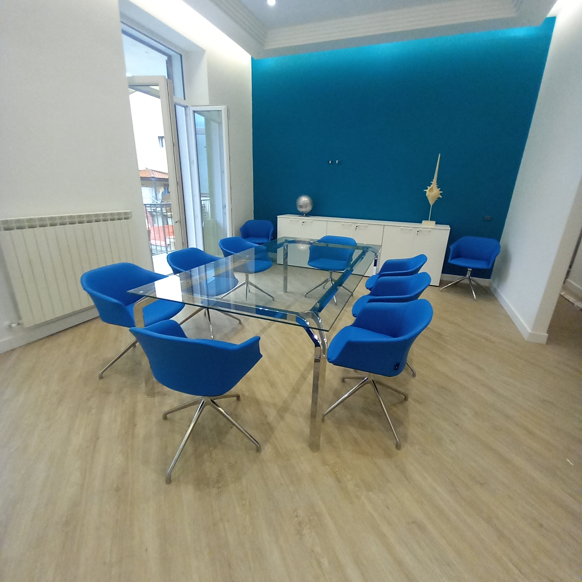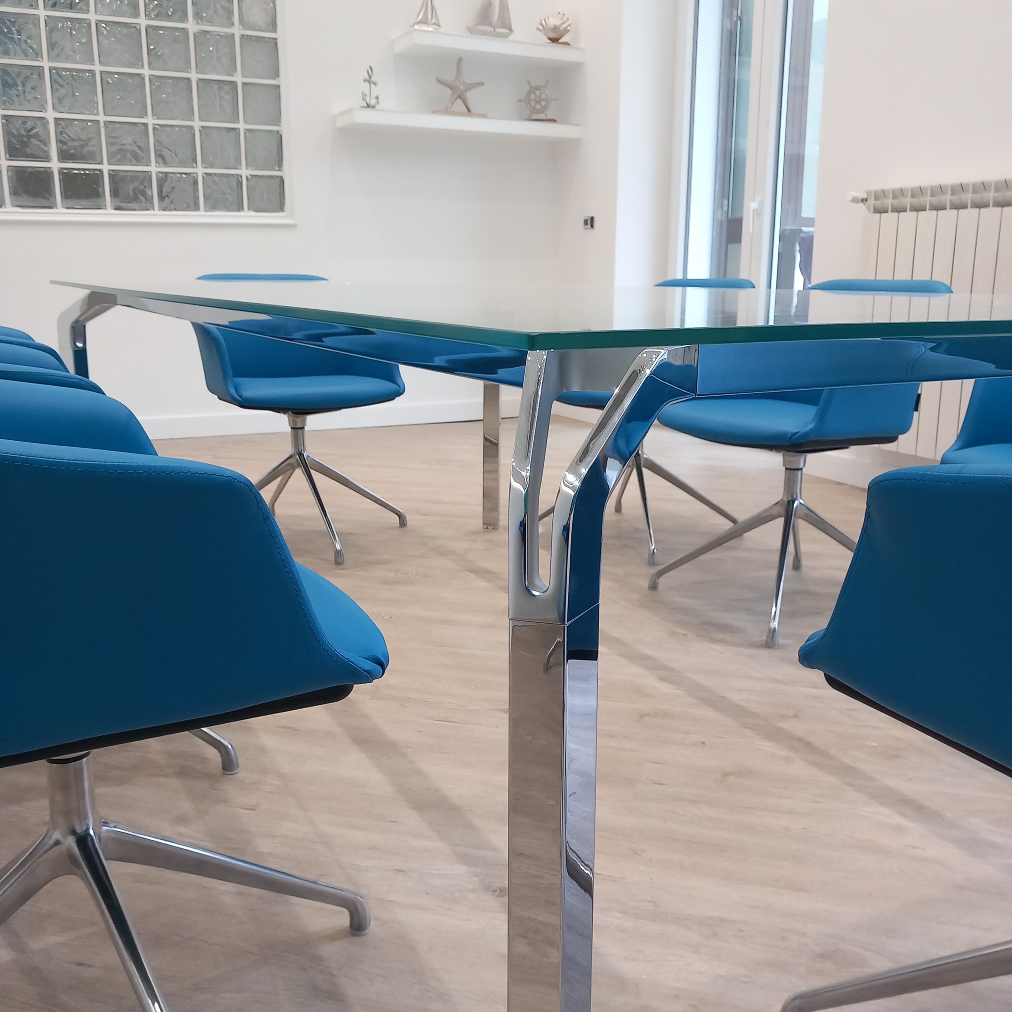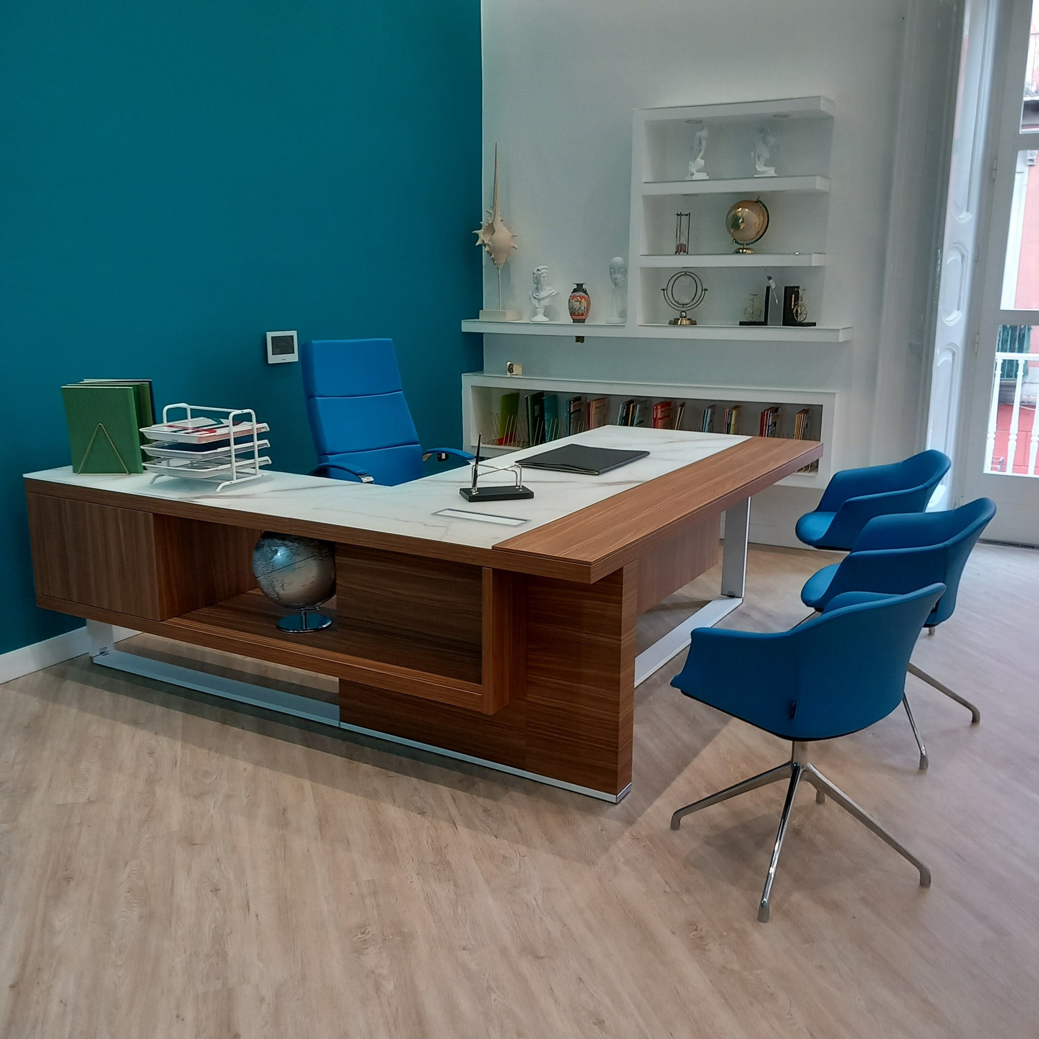 Gli arredi, scelti per coniugare eleganza e funzionalità, comprendono scrivania direzionale con vetro serigrafato effetto marmo e struttura in noce maroncelli moderne dotate di tecnologie ,tavolo riunione dalla struttura in alluminIo cromato piano in vetro temperato 10mm trasparente che dona leggerezza e continuità visiva .Reception e mobili contenitori dal colore bianco aggiungono una nota di vitalità e freschezza.